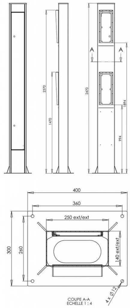 Dimensions de la borne : H 2470 x L 250 x P 140 mm.