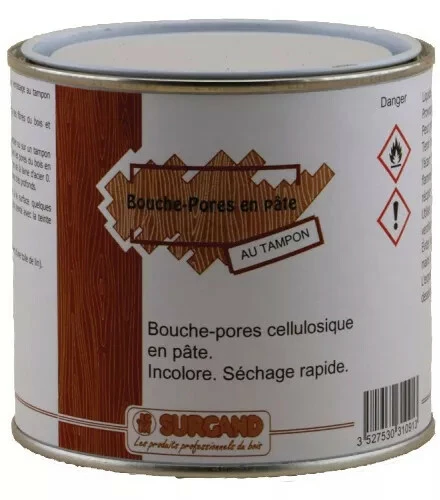 Pâte incolore cellulosique pour remplir et garnir les pores du bois avant le vernissage au tampon traditionnel.