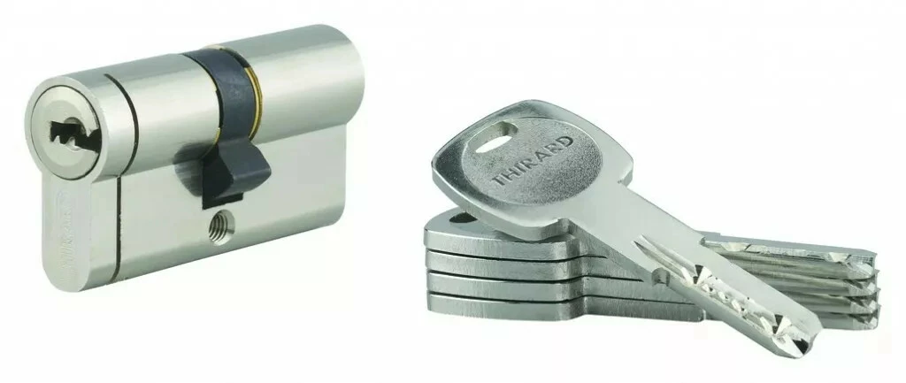 Mécanisme à 6 goupilles protection contre le crochetage. Protection contre le perçage par 1ère goupille + poussoir en acier trempé.