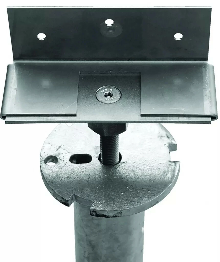 Fixation du profil en bois par le côté (équerre coulissante) ou par le dessous directement sur la base.