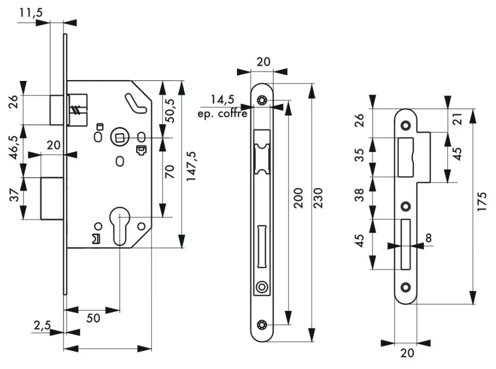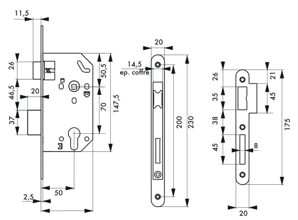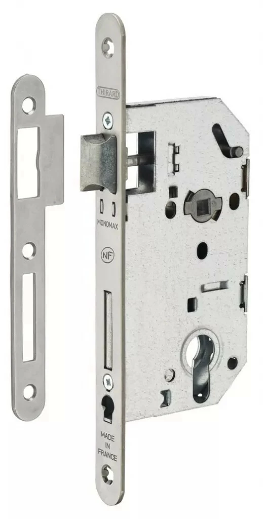 Coffre acier embouti. Têtière acier. Demi-tour bipente alliage réversible. Pêne acier galvanisé.