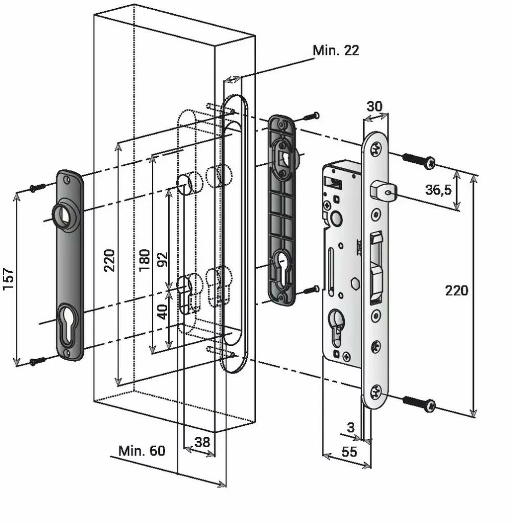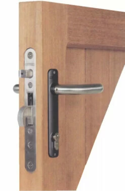 Entraxe 92 mm, fouillot carré 8 mm. Mécanisme, crochet, tétiêre et pêne en acier inoxydable. Ancrage du crochet 33 mm. Entraxe entre le cylindre et la béquille de 92 mm.