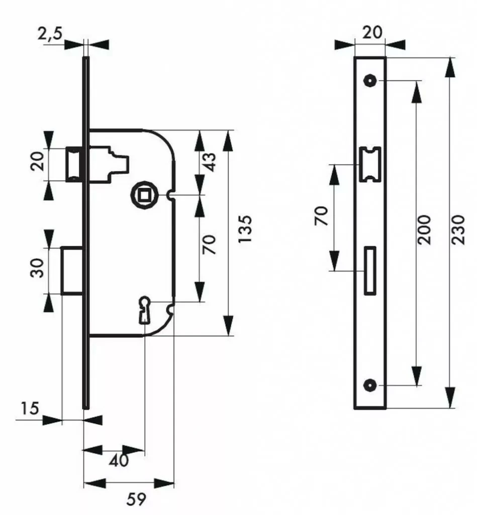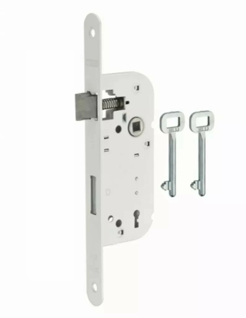 Mécanisme à 3 gorges, 2 tours. Fouillot carré de 7 mm. Entraxe 70 mm, 2 clés.