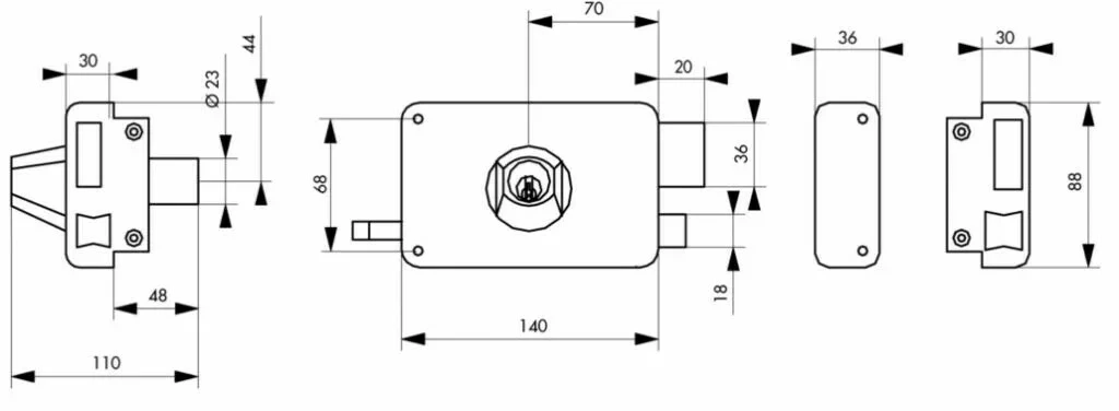 Largeur du pêne dormant de 36 mm (rep. P).