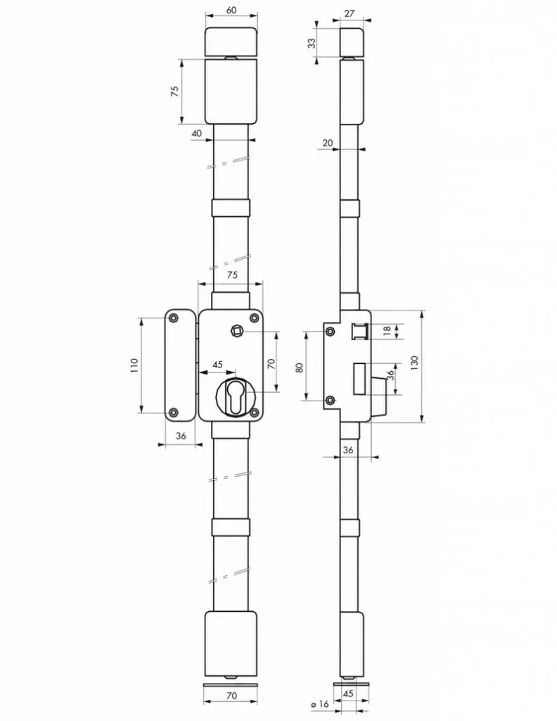 Pêne haut et bas en acier ø 16 mm sur tringles télescopiques permettant un ajustement