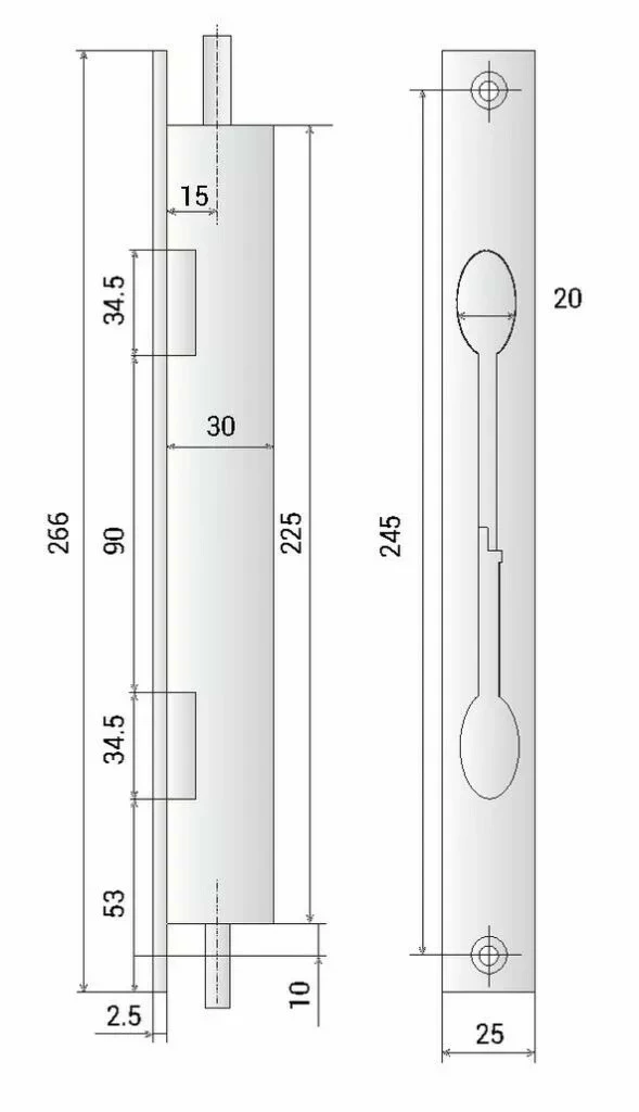 Course des tringles de 20 mm. Sortie des points haut et bas par le levier.