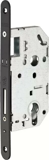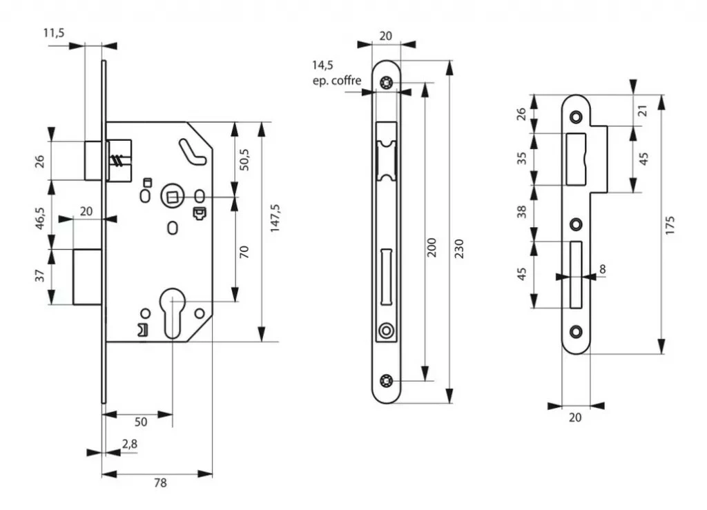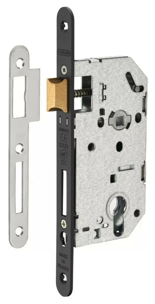 Coffre acier embouti galvanisé et têtière acier bouts ronds. Pêne et gâche plate acier zingué.