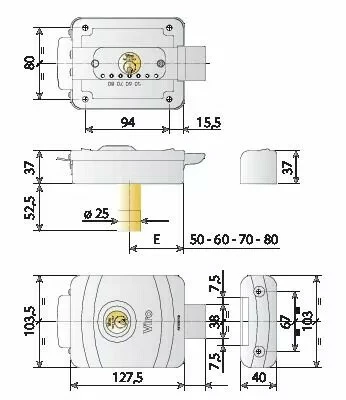 entrée réglable à 50, 60, 70 et 80 mm. Pêne basculant.